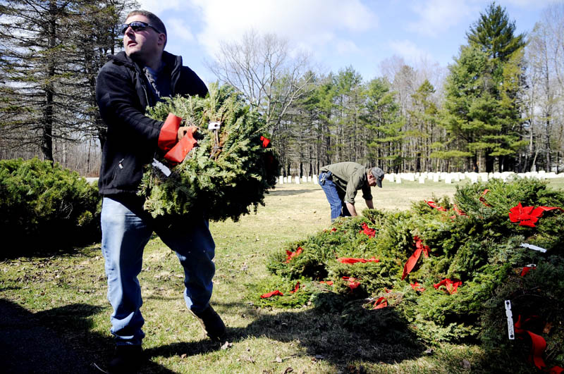 Travis Frost, left, and Bob Whitehouse collect wreaths from the Togus National Cemetery Thursday.  Hundreds of the pine wreaths that adorned the gravestone of soldiers over the winter were being collected and disposed of by the grounds crew at the federal veterans’ hospital.