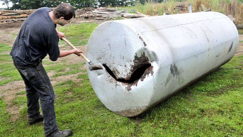 HOLE IN ONE: Tyler Mitchell uses a splitting maul to pound a hole in an old fuel tank as required for recycling the tank on Thursday at the family farm in Troy.