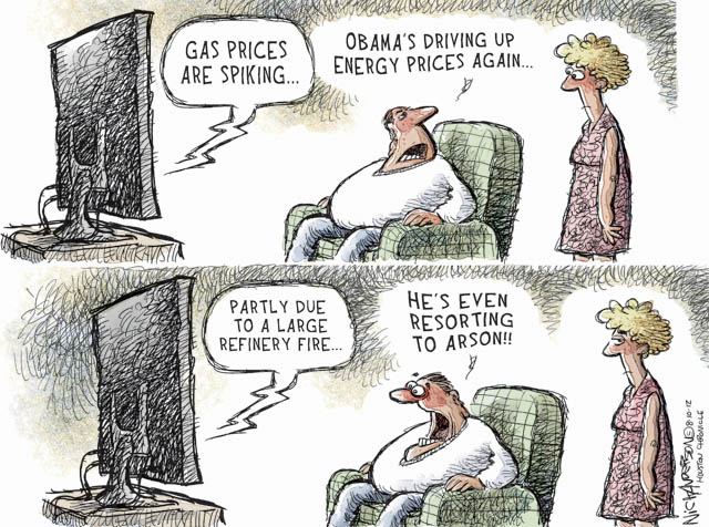 Houston Chronicle Editorial Cartoonist Nick Anderson pokes fun at rising fuel prices and how many consumers mistakenly blame the president for the increases.