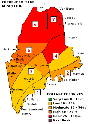 High foliage color between 50 and 75 percent is being reported in the Greenville and Jackman areas in northwest Maine, while moderate foliage color is being reported in the Rangeley region across the state to the eastern Maine coast.