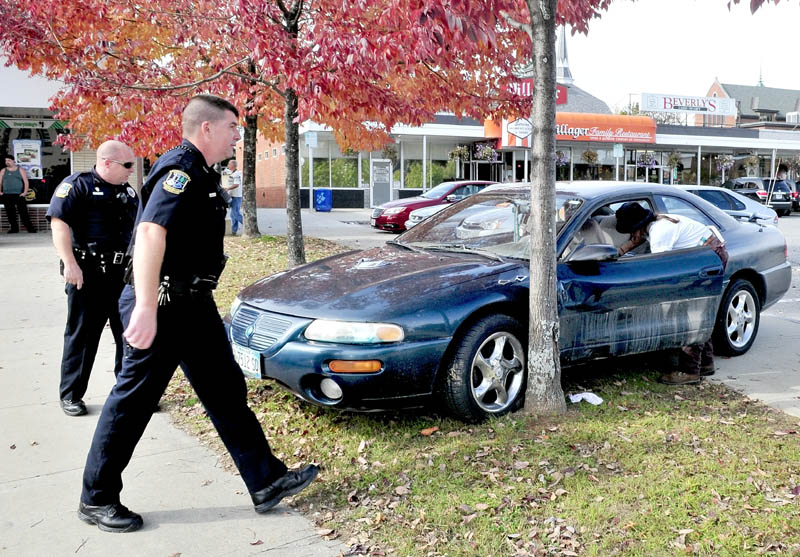 WATERVILLE — A Fairfield woman was taken to the hospital Tuesday after the car she was driving plunged forward in The Concourse parking lot, pinning her leg between the car door and a tree.
