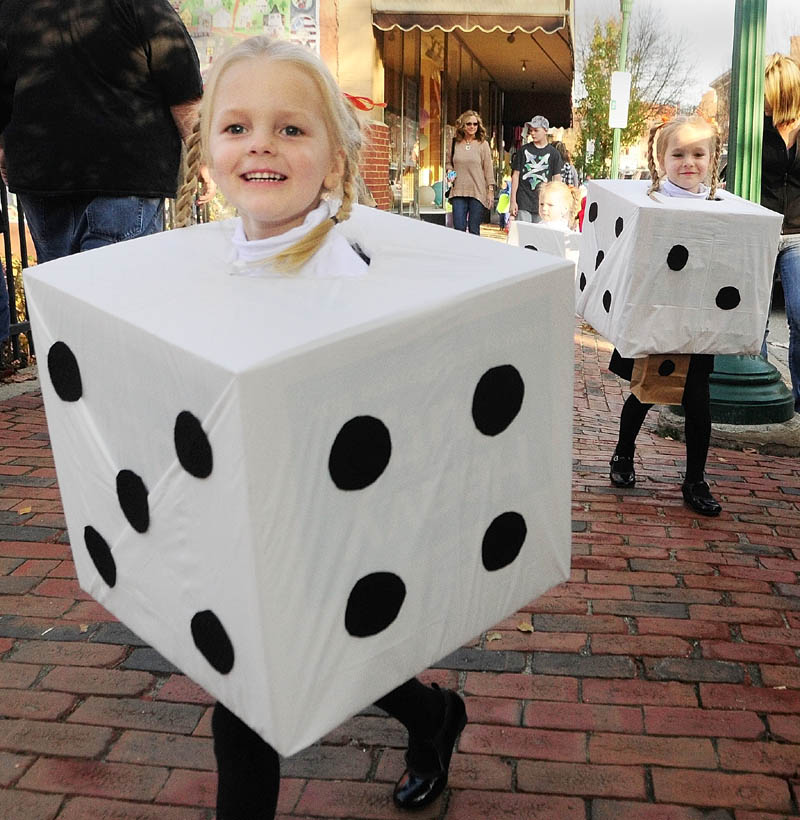 Hallee McCarthy, 3, left, leads her sisters Chloe, 4, right, and Taylor, 3 center, as the three girls from West Gardiner, walk down Water Street on Friday afternoon in downtown Gardiner. Hundreds of people were trick or treating at businesses on the street before a parade and costume were held.