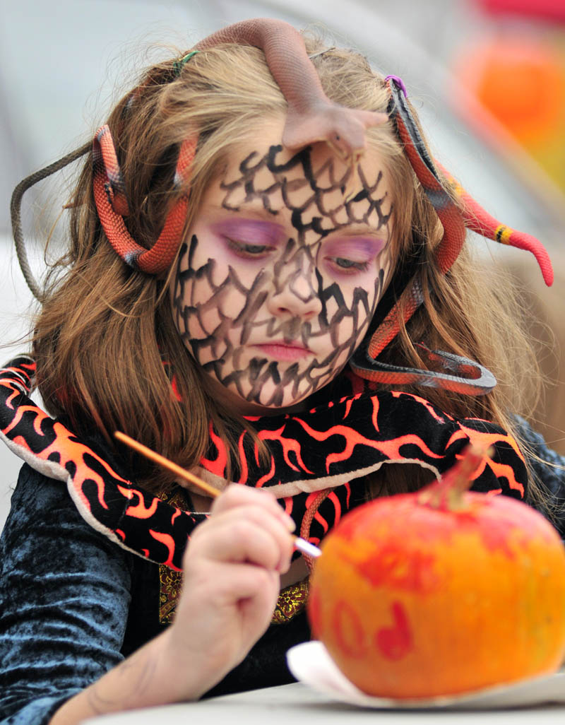 Sedona Kmen paints a pumpkin during Halloween events on Wednesday afternoon at the Gardiner Farmers Market on the Common. Besides the the usual market stalls, there were face painting and games for the holiday.