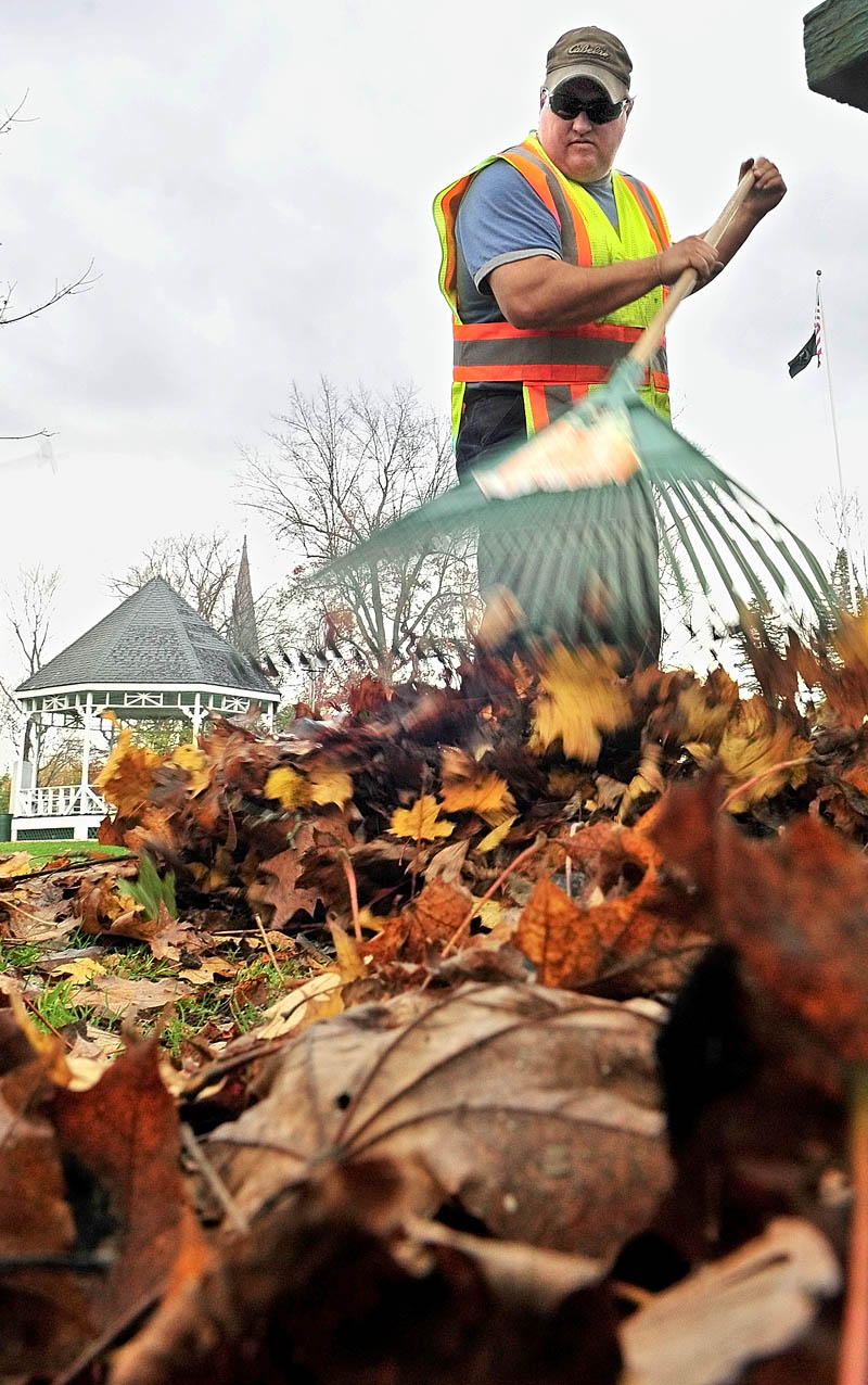 Gardiner city worker Pat Chadwick rakes leaves towards tube that sucks them into a truck on Wednesday afternoon. He was part of a crew cleaning up leaves on the Gardiner Common.