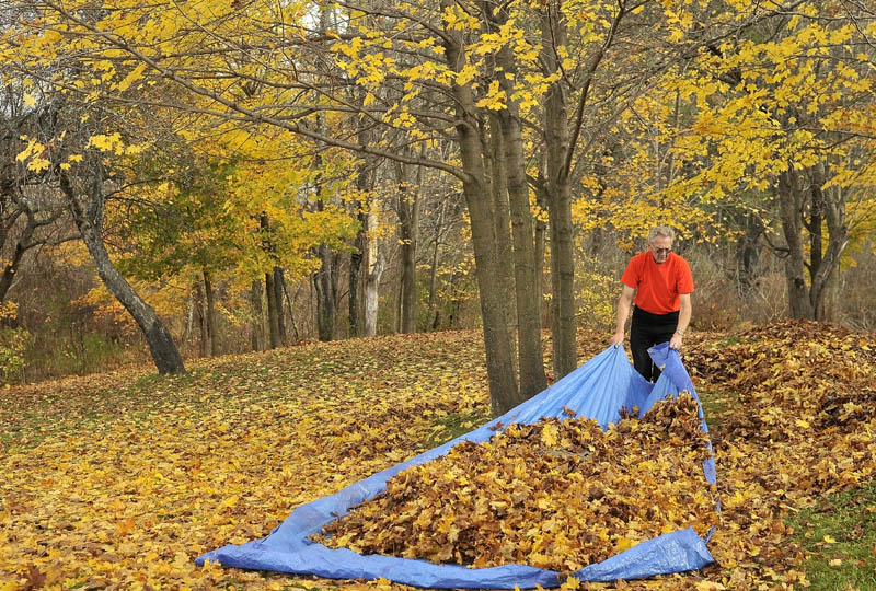 Maynard Weeks, 74, clears his property of leaves on West River Road in Waterville Friday. Weeks tackles the yard work every weekend until all of the leaves have shed the tree. He says chopping wood and raking his yard keeps him young and busy.
