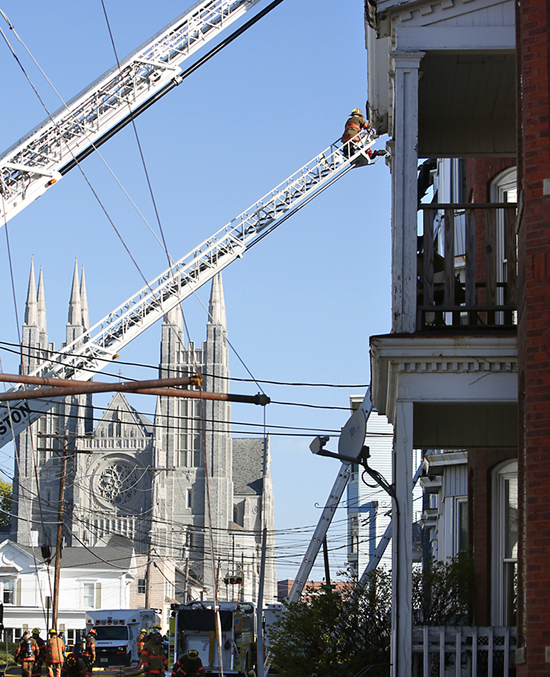 Monday’s fire was spotted by a police sergeant who was on patrol in the neighborhood, Bussiere said. First responders quickly evacuated nearby buildings. During the evacuations, an officer was injured slightly while kicking in a door.