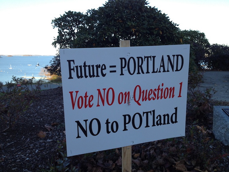 The small campaign signs are the first indication of any organized effort to defeat a citizens initiative that would remove all criminal and civil penalties for adults who possess as much as 2.5 ounces of marijuana in Portland. The proposal will be Question 1 on the city ballot Nov. 5.