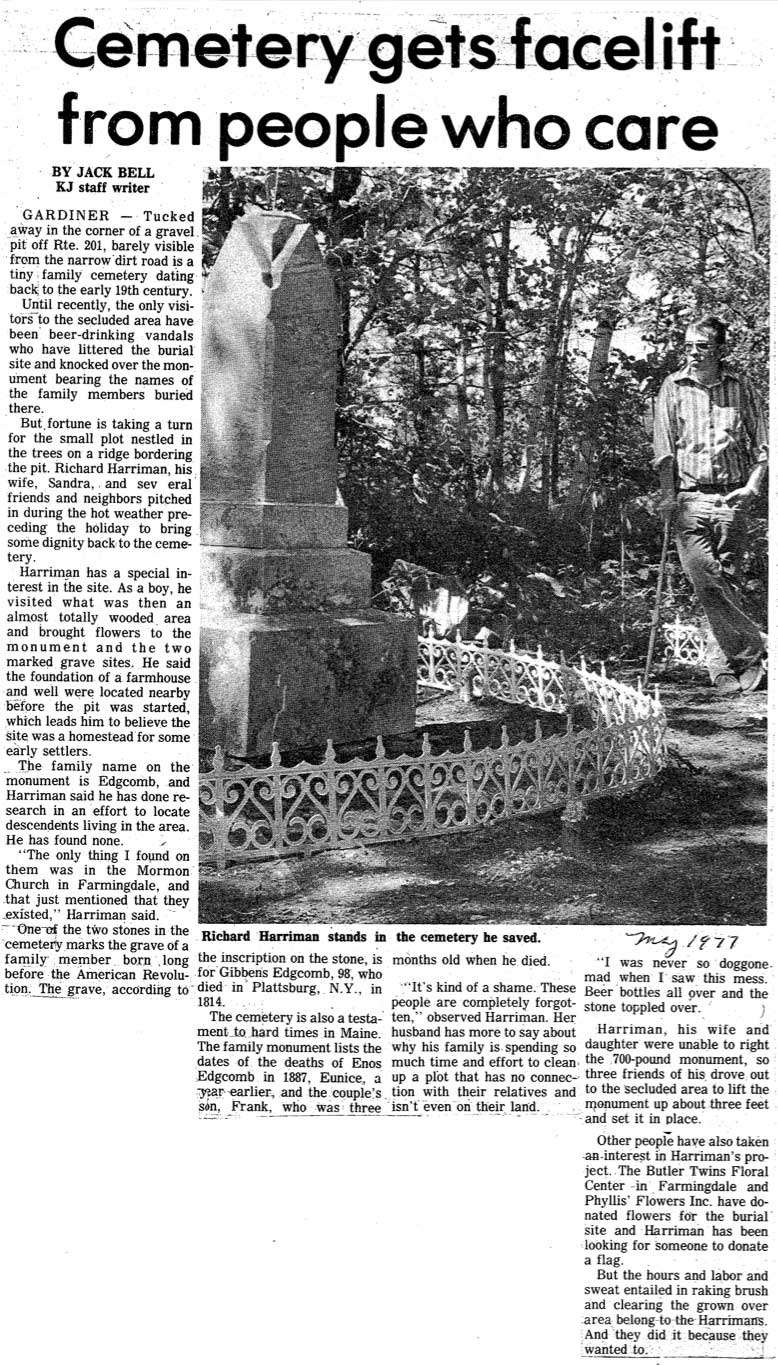 Edgecomb was a veteran of the Revolutionary War, according to Anne Cough, a Gardiner resident who has researched the history of the burial site. The other veteran was another Gibbens Edgecomb, who died in 1878 at the age of 87 and served in the War of 1812, Cough said.