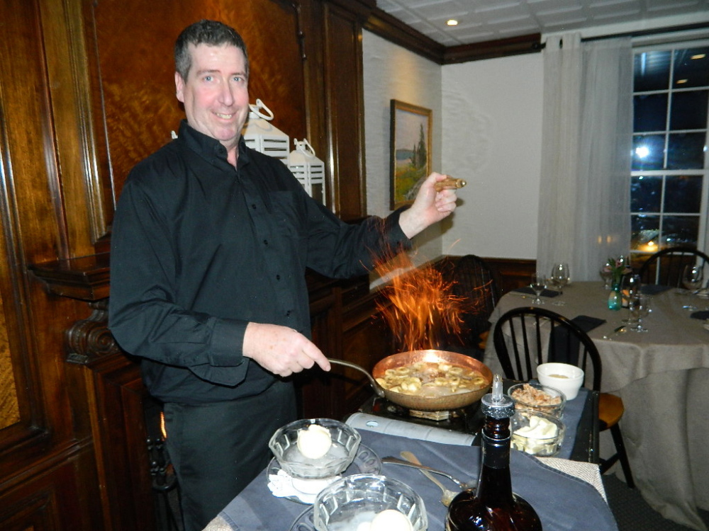 The flaming performance was very entertaining. The fresh-sliced bananas, Tia Maria and Canadian pecans, flamed with Myers dark rum, and served on homemade vanilla ice cream — well, just the description still makes me smile. I noticed Linda ate all of hers.
