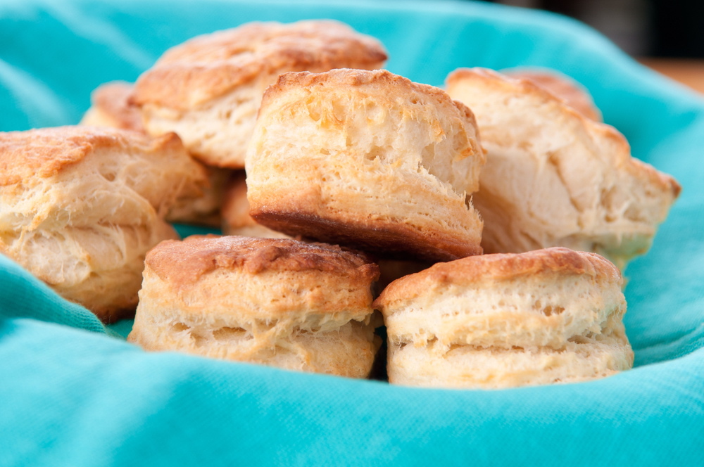 Gently roll out or pat the dough until it’s 3/4-inch thick. Cut out biscuits with (beautiful wooden) biscuit cutter, pushing any trimmings back into the biscuits, and place close together in an ungreased 9-by-9-inch pan. Bake for about 12 minutes until the tops are golden brown.