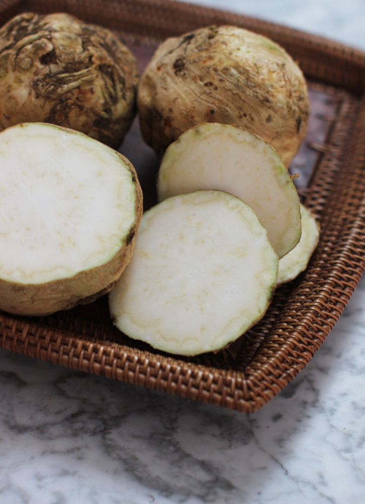 In France, this knobby root cousin of the celery we are more familiar with is used in soups, as a puree, raw in salads, as well as in a typical French slaw-like dish called “celeri remoulade.”
