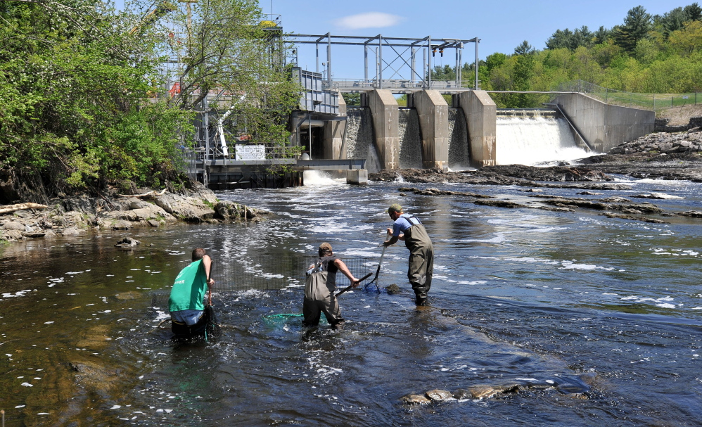 BENTON — Dressed in green chest waders and armed with nets, the three fishermen approached a net trap set in the fast-moving water of the Sebasticook River just below the Benton Falls Dam.
