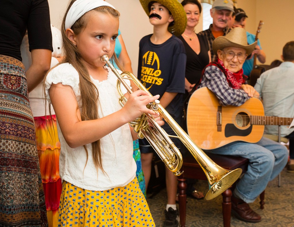 As Farrell’s grandchildren bused the tables after lunch, a few of them broke into song. The music continued as the assisted living facility’s staff set up rows of chairs in the room and more in the hallway outside. Two brothers tuned their guitars to each other, while the youngest cousins blew out notes on brass instruments.