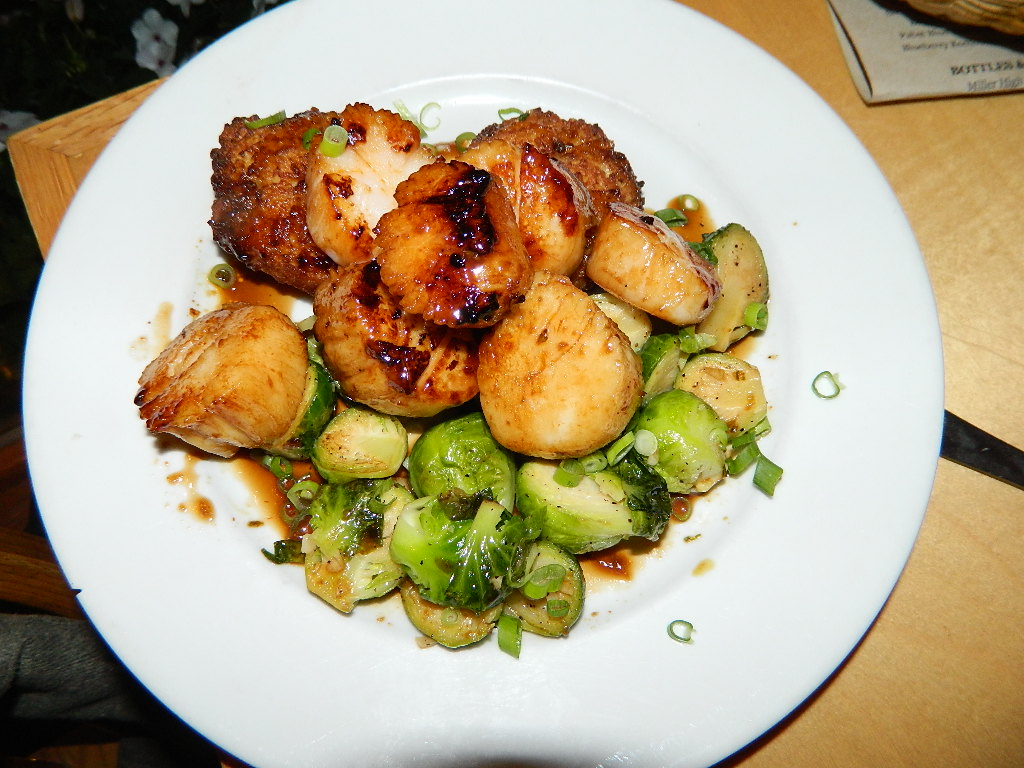 Linda then opted for a sandwich, the Bang Bang, featuring all-natural chicken, fried, with housemade aioli and spicy slaw. She said the spicy Korean-BBQ slaw made the sandwich really special. I stuck with the seafood theme (after all, we were just a minute’s walk from the sea), with the Seared Scallops. We both loved the Korean barbecue sauce, and Linda wished she knew more about Korean spices. The French fries here are especially good, too.
