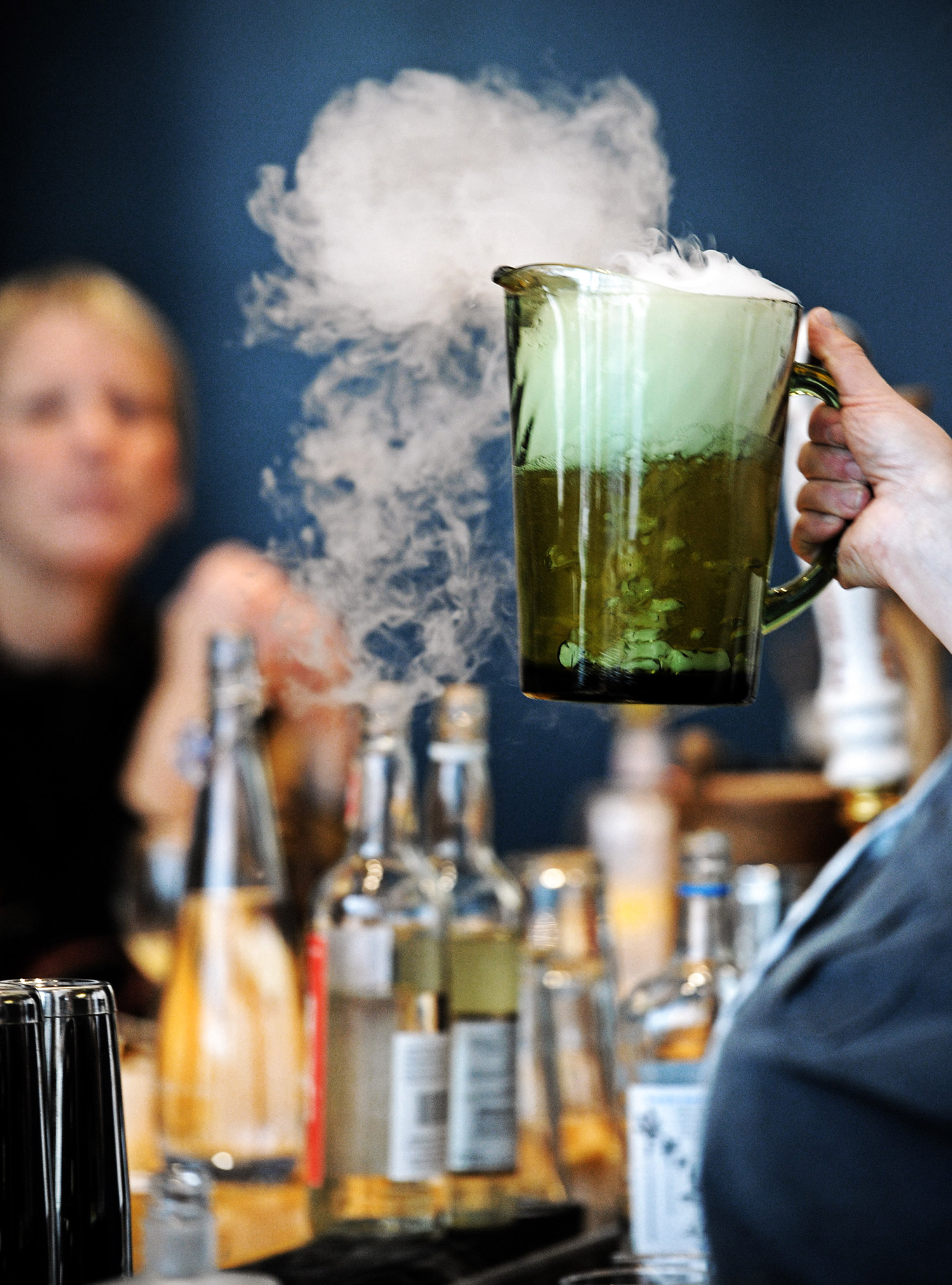 It’s a question of context, Bourgon says: He has a friend and former TNT Bar colleague who now works at a bar in D.C., and his friend says he’d never do dry ice there. “U Street on a Friday night, crazy drunken people, someone would do something stupid – take it out of the drink, put it down someone’s back.”