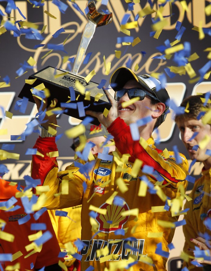 Drivers spins out Kenseth late, gets victory in Kansas.