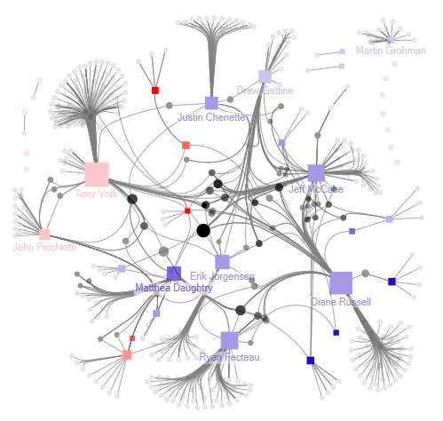 As you can see, raw mathematics isn’t enough to obtain meaning. Take the Data Visualization seminar taught by one of our professors of art (CIS 352) to learn the principles of visual design that lead to a more sensible image like the one you see below. In this image, legislators are squares, non-legislators are round, Democrats are blue, Republicans are red, the larger accounts issue more tweets, the darker accounts are mentioned by other legislators more often, and the 10 most active legislators are labeled.