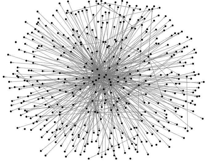 Let’s get practical. Using COM 475, CIS 450 and SOC 375 techniques, let’s look at the real social network of Maine state legislators on Twitter in the first half of February 2016. If a legislator or another account to which the legislator communicates over Twitter is depicted as a dot, and if each communication between them is a line, the raw mathematical pattern of contacts between Maine legislators looks like this: