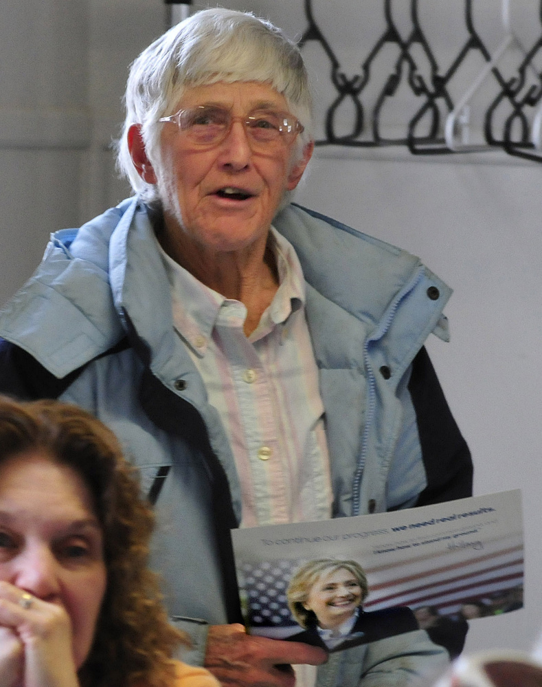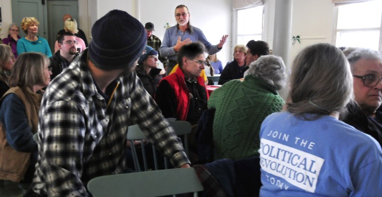 In Wilton, about 75 registered Democrats, several of whom had recently registered with the party, packed the Wilson Grange Sunday afternoon for just over an hour to advocate their preference between presidential candidates Sen. Bernie Sanders, I-Vermont, and former Secretary of State Hillary Clinton.