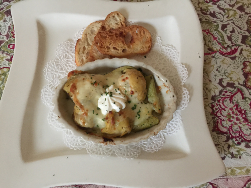 I ordered the baked artichoke hearts appetizer. Marinated artichokes were topped with a bit of Vermont cheddar cheese and sour cream. This came with crunchy crostini and was unusual and delicious.