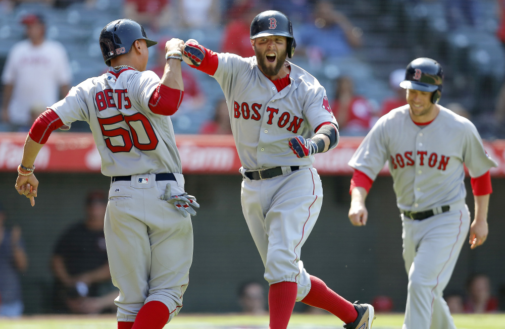 Boston salvages split with Anaheim on 2nd baseman’s 9th-inning home run.
