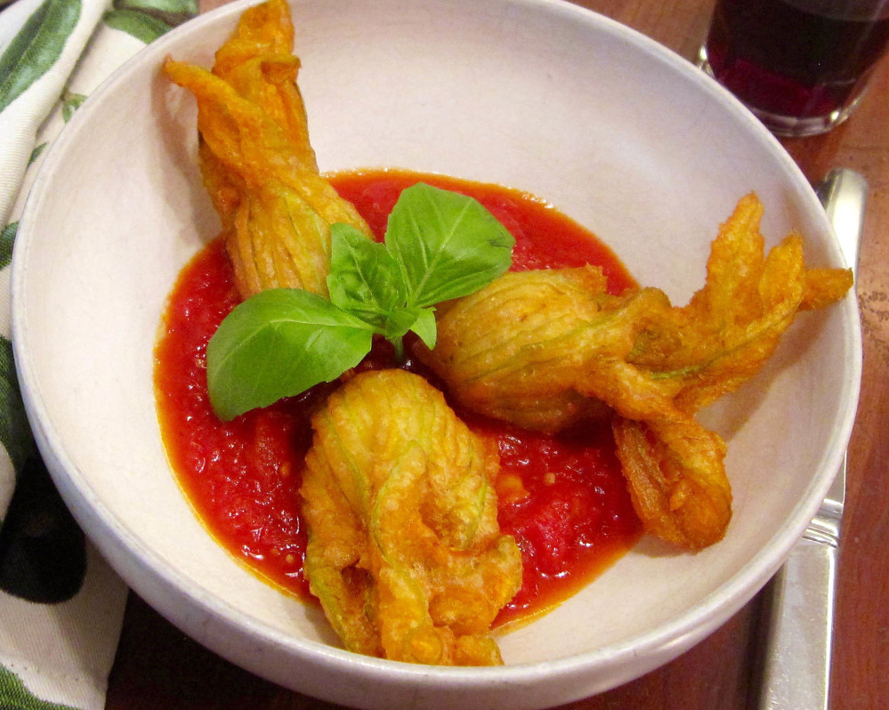 To serve, spoon one-fourth of the marinara sauce into the bottom of each of four soup bowls, arrange three fried blossoms on top and garnish with a basil sprig.