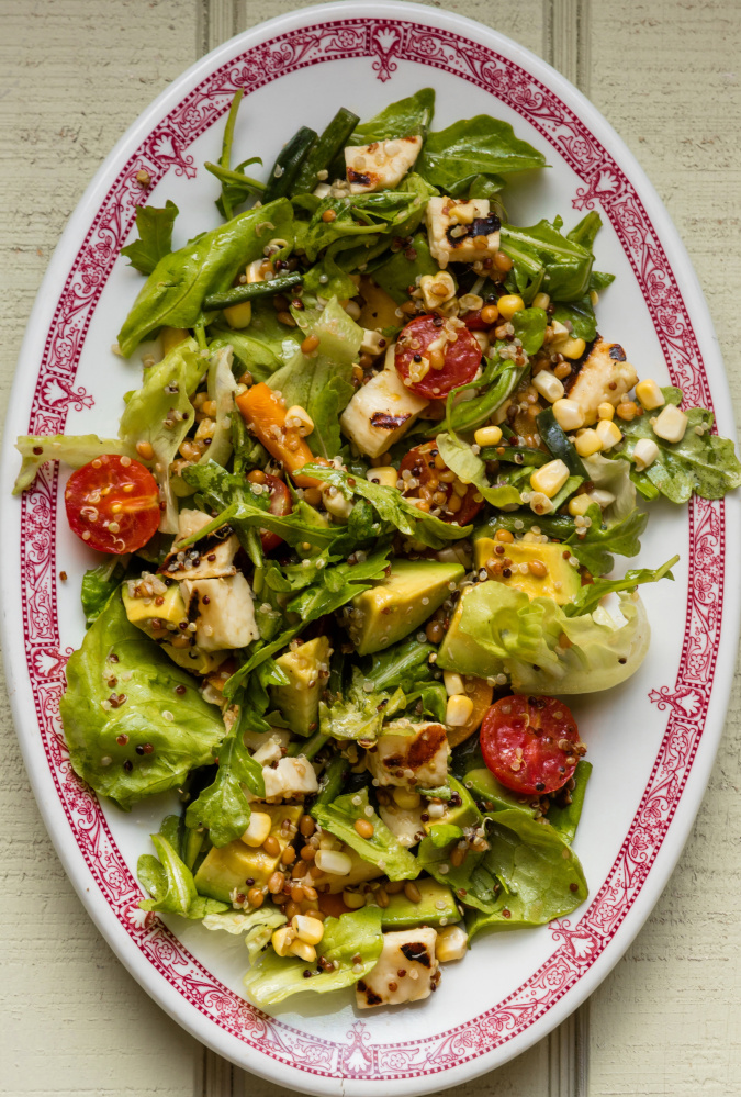 Combine the butter lettuce and arugula, avocado, pan-grilled halloumi pieces, wheat berries, quinoa and the lightly marinated vegetables in a large serving bowl. Gradually pour in the dressing, adding just enough to coat; toss well. (You might not use all the dressing.)