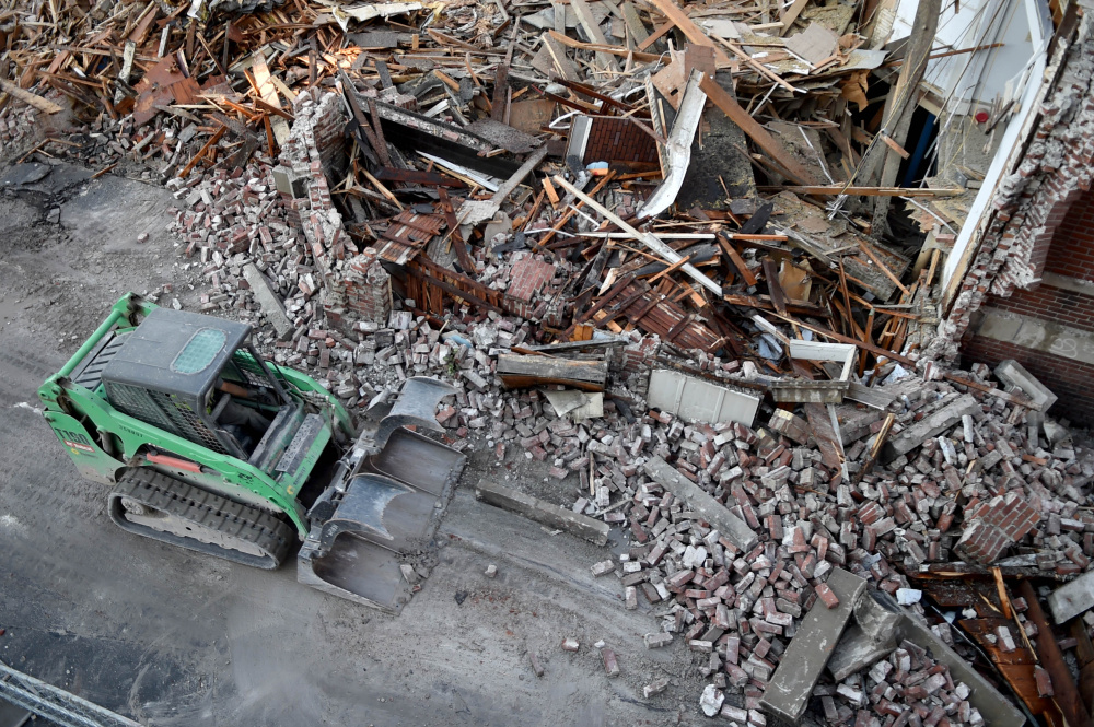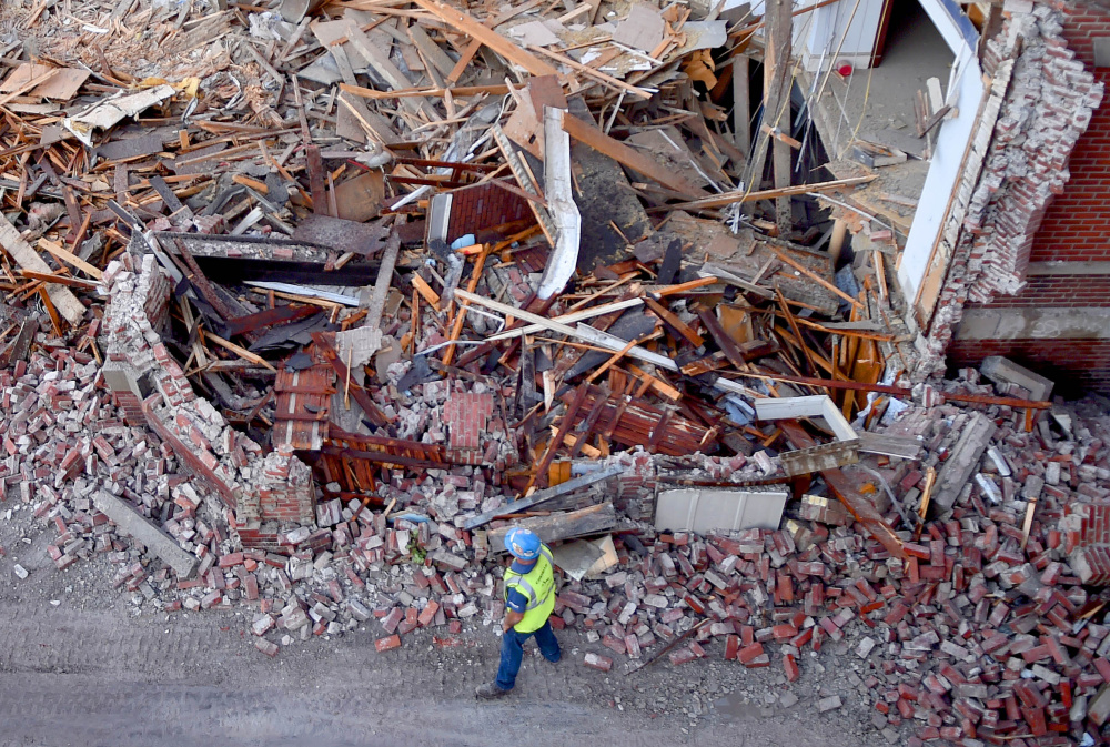 A worker from Costello Dismantling Co. of West Wareham, Massachusetts, stood Wednesday morning with a hose, spraying water on the piles to keep the dust in check with half of the building torn down. Appleton Street remained open to traffic and pedestrians continued to stroll the sidewalks.