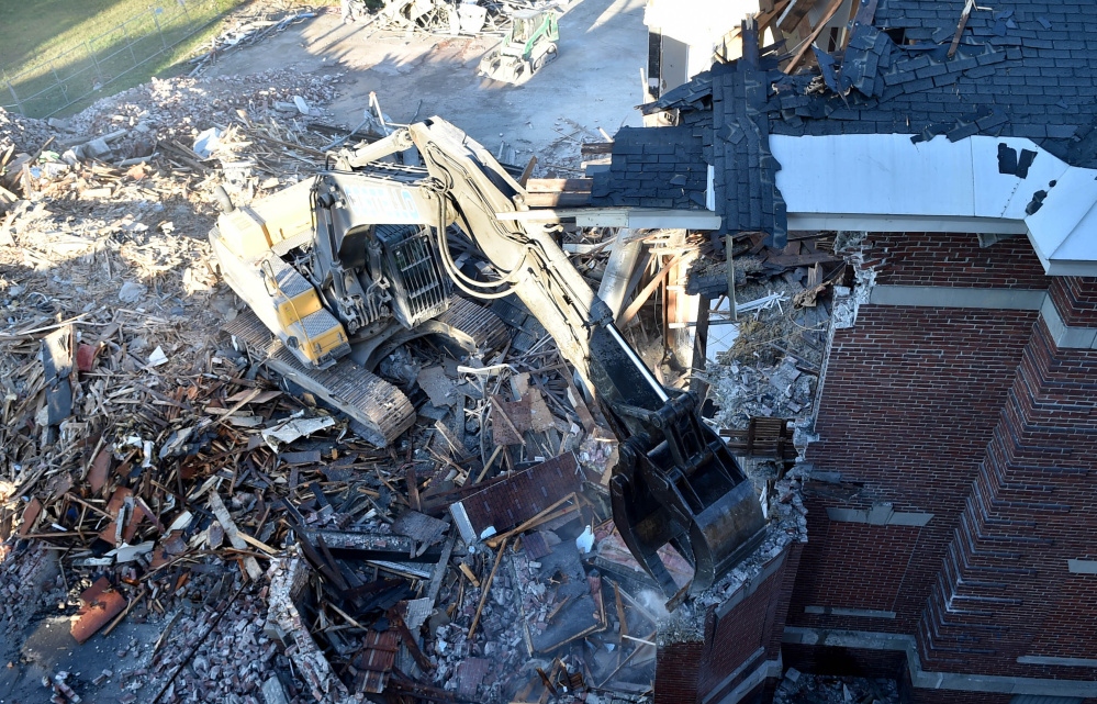 WATERVILLE — The 102-year-old former Waterville Elks building on Appleton Street is coming down inch by inch, with piles of bricks and mortar next to it growing larger with each sweep of the excavator.