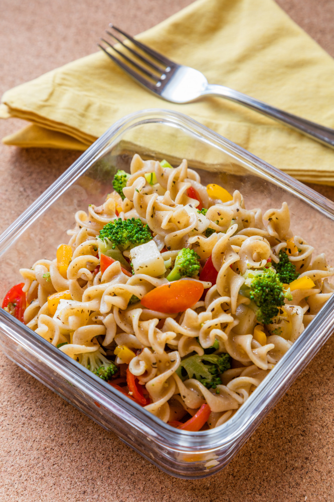 This colorful pasta salad, full of vegetables and fresh mozzarella cheese in an herb-garlic vinaigrette dressing, earns its name for being an ideal meal to tote to work or school.