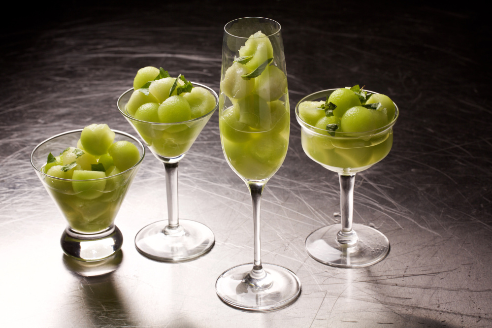 Then add balls of sweet, juicy honeydew melon, and let the mixture steep in the refrigerator for at least two hours, so the flavors can meld and everything is well chilled. Spoon into cocktail glasses, shower with a fragrant, floral confetti of basil, and you have a grown-up dessert that is fresh, fun and glamorous.