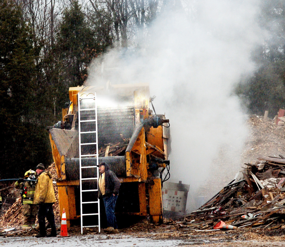 As sleet and freezing rain fell on the transfer station grounds, firefighters were on top of the machine, trying to gain access to its interior by using pike poles. “They’re trying to get access to the actual grinder to extinguish the fire that’s inside there from the debris that they were grinding,” Coughlin said.