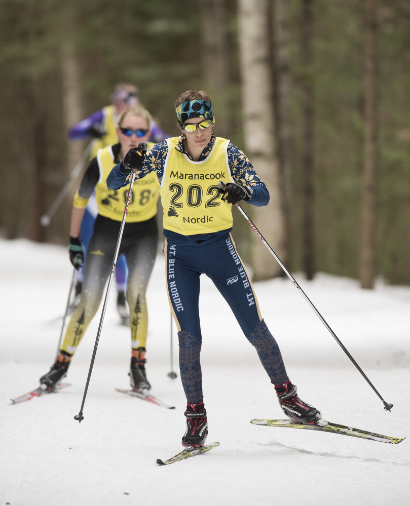 Facing slushy snow and high temperatures and prevailing nonetheless, the Mt. Blue and Maranacook Nordic teams skied their ways to first-place finishes at the Maranacook Wave race Saturday morning. The teams claimed the same victories they did at the previous weekend’s Hornet Classic, with Mt. Blue (34 points) taking the boys race ahead of Maranacook (41), Oxford Hills (52), Central Maine Ski Club (103) and Leavitt (122), while Maranacook (32) finished first in the girls race just ahead of the Cougars (34) and in front of Gould Academy (51), CMSC (86) and Maine Coast (104).
