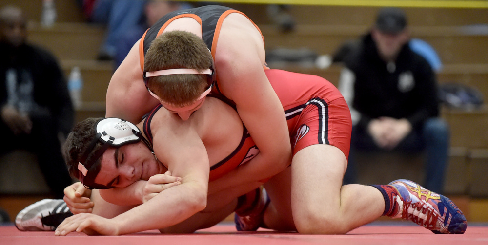 Abbott had an excellent performance for the Black Raiders, notching two pins before beating Cony’s Nic Mills, 4-1, in the final. He immediately followed Fredette, who had three straight pins — all in under a minute — before scoring a 10-0 win over Oxford Hills’ Zuka Mabior, whom he had already beaten twice before.
