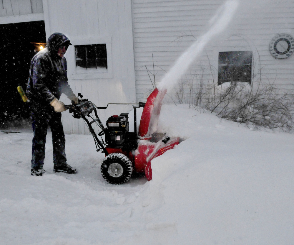In Skowhegan, Road Commissioner Greg Dore said he measured 15 inches outside the town garage Monday morning as heavy snow continued to fall. He expected another 8-10 inches before it all wound down.