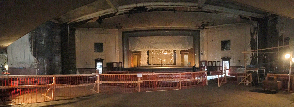 Parkhurst said the building still has numerous problems to be addressed to restore it and bring it up to modern building codes, including fixing the still-gaping big hole in the floor. But many of the building’s original features, including ornate trim, a large cantilevered balcony built so it doesn’t need beams below it that could obstruct the views, and two cherub murals on either side of the stage remain, ready to be restored.