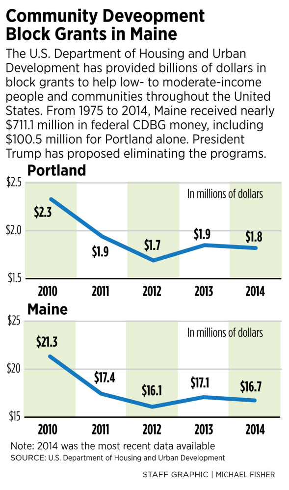 Johnson notes that Maine’s CDBG funding is already on the decline: in 2001, the state received $16.4 million for the program, and by 2015 that had dropped to $10.7 million.