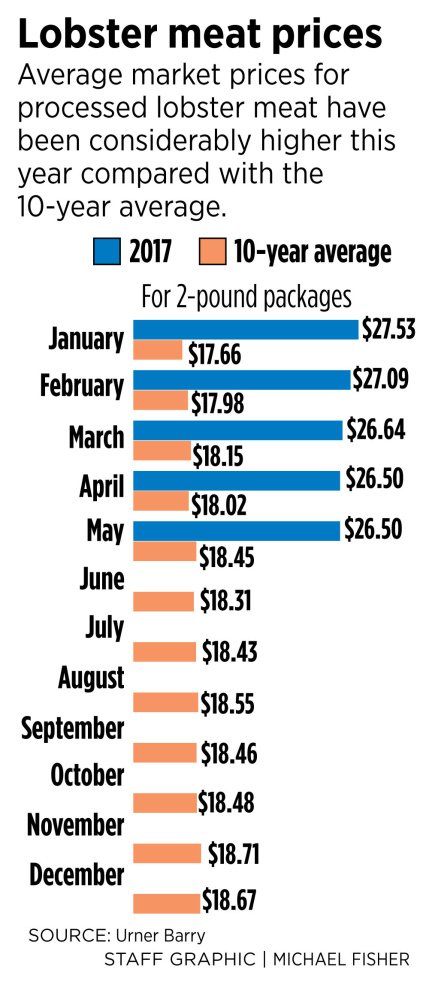 A 1¼-pound hardshell lobster reached an average wholesale price of $12 per pound back in April, according to commodity news reporting service Urner Barry, compared with $10.15 per pound at the same time last year and $7.15 in 2012. By early May, that price had dropped to $8.13 per pound. Claw and knuckle meat is averaging $26.75 per pound, after reaching a high of $29.75 last summer. It retails for $50 a pound or more.