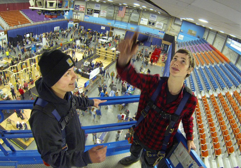 Fortin was speaking of the two large scissor lifts taking several students at a time — secured in safety harnesses — more than 20 feet above the civic center floor. It was one of the areas that was most popular among the attendees, said Hope Perkins, president and CEO of the Maine chapter of Associated Builders & Contractors.