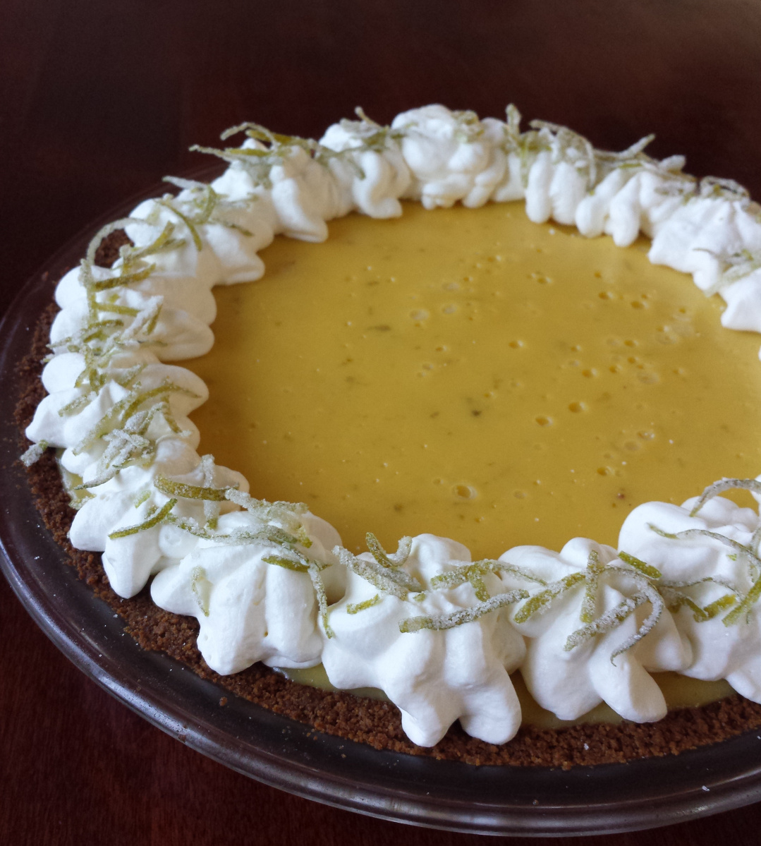 In a second large bowl, beat the egg whites until firm peaks form. Fold one-third of them into the custard mixture, then fold in the remaining whites. Pour the custard into the pie crust and bake for 15 minutes, or until barely set. Transfer to a rack and let cool completely, then refrigerate overnight. Serve with sweetened whipped cream and garnish with candied lime zest.