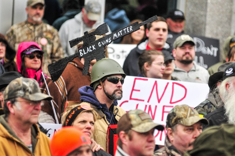 No real firearms were in evidence. However, silhouettes were printed on flags, on signs and even carried atop helmets.