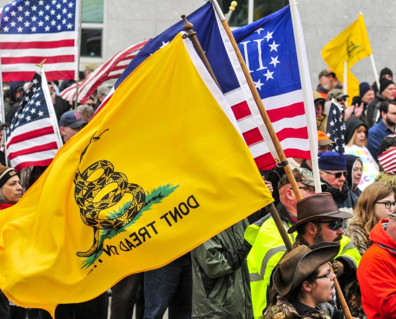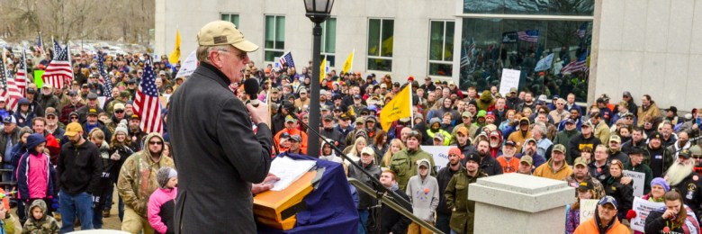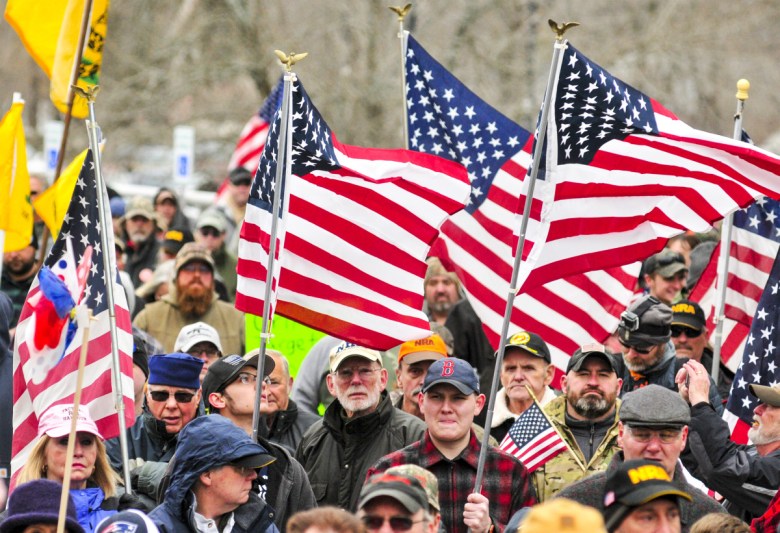 AUGUSTA — Hundreds of flag-holding, sign-carrying people rallied Saturday at the plaza between the State House and the Burton M. Cross State Office Building in support of maintaining their right to bear arms and warning politicians against interfering with that.