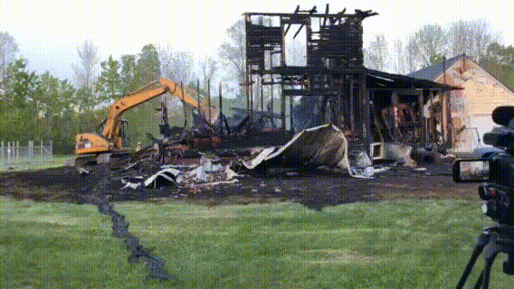 At the scene, the charred shell of the house smoldered as firefighters worked to contain fire in the garage. The fire also spread to a back lawn and went into the woods, Russell said. Because there are no fire hydrants, firefighters had to haul water from fire ponds.