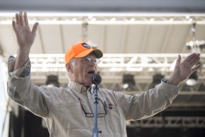 He asked the audience to listen to him utter a moose call and then follow suit. He said callers could pinch their noses if they wanted to. Collectively, what appeared to be an audience of many more than 1,000 blared out their best cow call.
