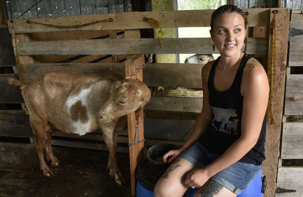 Farmer Kassie Dwyer takes a break from milking a goat named Diamond on Tuesday at the Eden farm in Athens. Dwyer is launching an effort to enact an Athens Food Sovereignty Ordinance, which would allow consumers to buy directly from farmers and food producers without state and federal licensing and inspections.