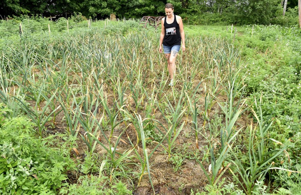 Athens farmer Kassie Dwyer walks through a patch of garlic growing in a huge garden Tuesday at her Eden farm in Athens. Dwyer is launching an effort to enact a Athens Food Sovereignty Ordinance, which would allow consumers to buy directly from farmers and food producers without state and federal licensing and inspections.