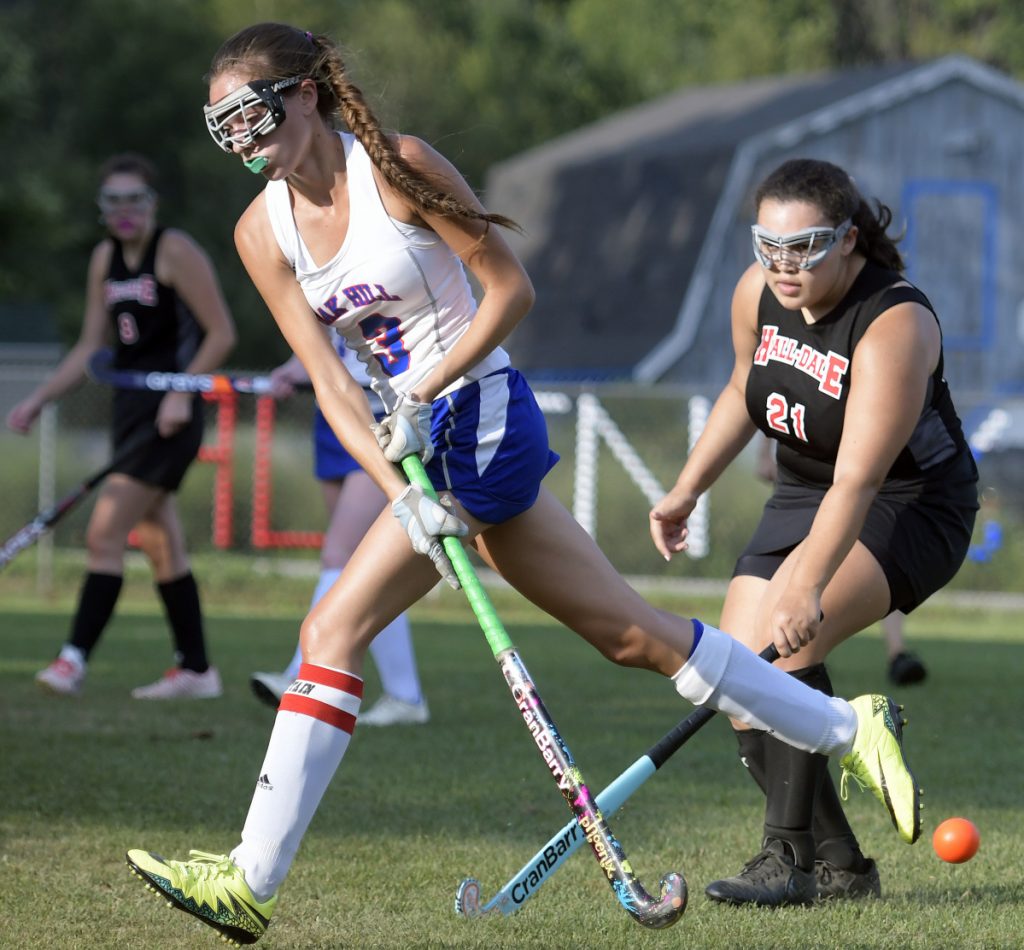 Buteau’s first goal came off a shot from Dumais that went wide. She collected the ball to the left of Hall-Dale goalie Mia Rollins (13 saves) and rifled a shot into the back of the cage from 12 feet out.