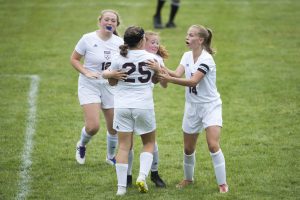 Richmond’s Laura Brown (25) celebrates with teammates after scoring against Rangeley on Saturday in Rangeley.
