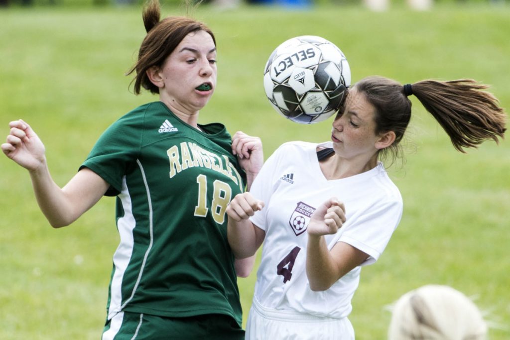 Rangeley’s Brooke Egan (18) battles for the ball with Richmond’s Bre Vintiner (4) on Saturday in Rangeley.
