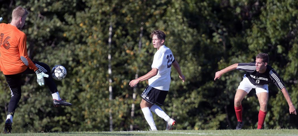In the 12th minute, junior Gabe Martin got on the end of a Hayden Fletcher cross but rang his half-volley off the left post. In the 49th minute, one of the rare instances of sloppy defending on a cross by Hall-Dale fell to Fletcher’s feet, and he turned to the short-side left and forced a lunging save from Shaeffer — which Shaeffer directed off the near post.